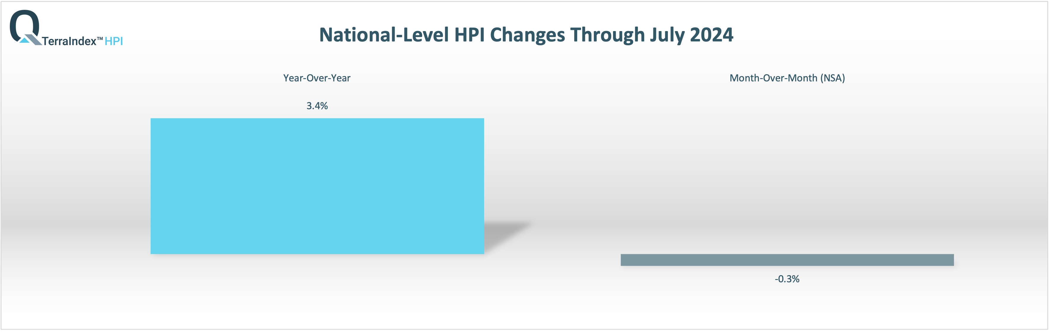 On a month-over-month basis, non-seasonally adjusted (NSA) home values decreased by -0.3% in July 2024. On a seasonally adjusted basis, nationwide home values decreased by -0.4% in the last month.